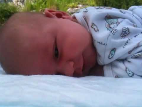Redan när Sophie är 3 veckor kan hon vända på huvudet när hon ligger på magen. Vi har en skön stund i gräset innan det är dags att sticka in till stan på ett möte.