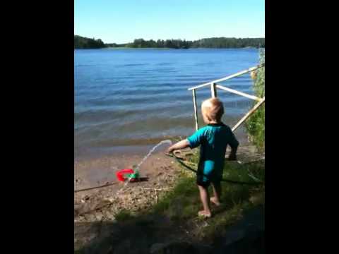 Idag åkte pappa och Arthur ut till landet eftersom mamma ville kolla någon fotbollsmatch på tv i fred. Med 26 grader vid huset drog vi ner till badplatsen och svalkade oss lite. Arthur tyckte alla behövde lite extra vattning.